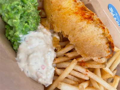 私のフィッシュアンドチップスは、魚のフライが超サクサクで、タルタルソースやグリーンピースのソースとマッチしてとても美味しかったです。