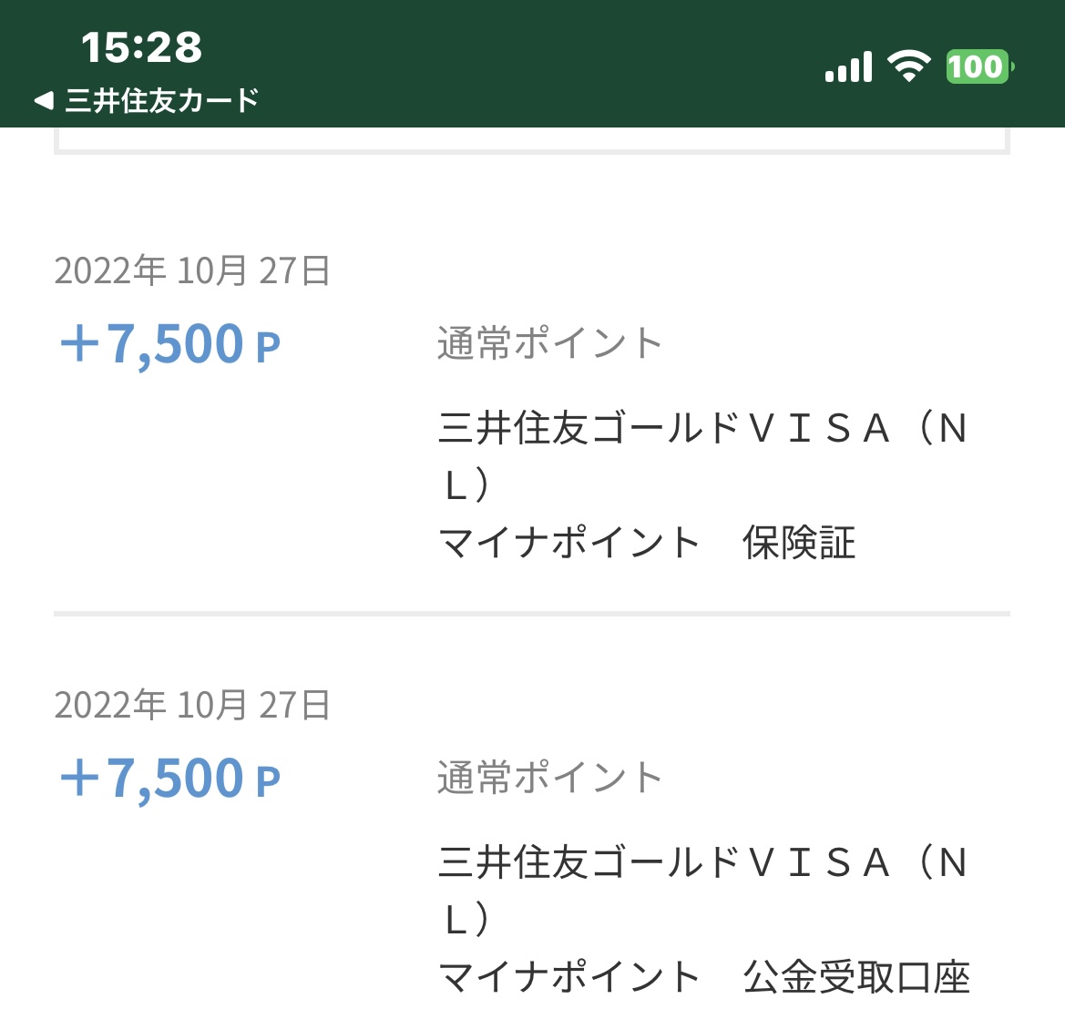 私はすでにマイナンバーカードを取得していましたので、今回もらえたのは、「保険証」と「公金受取口座」の分でそれぞれ7,500ポイントずつの合計15,000ポイントになります。